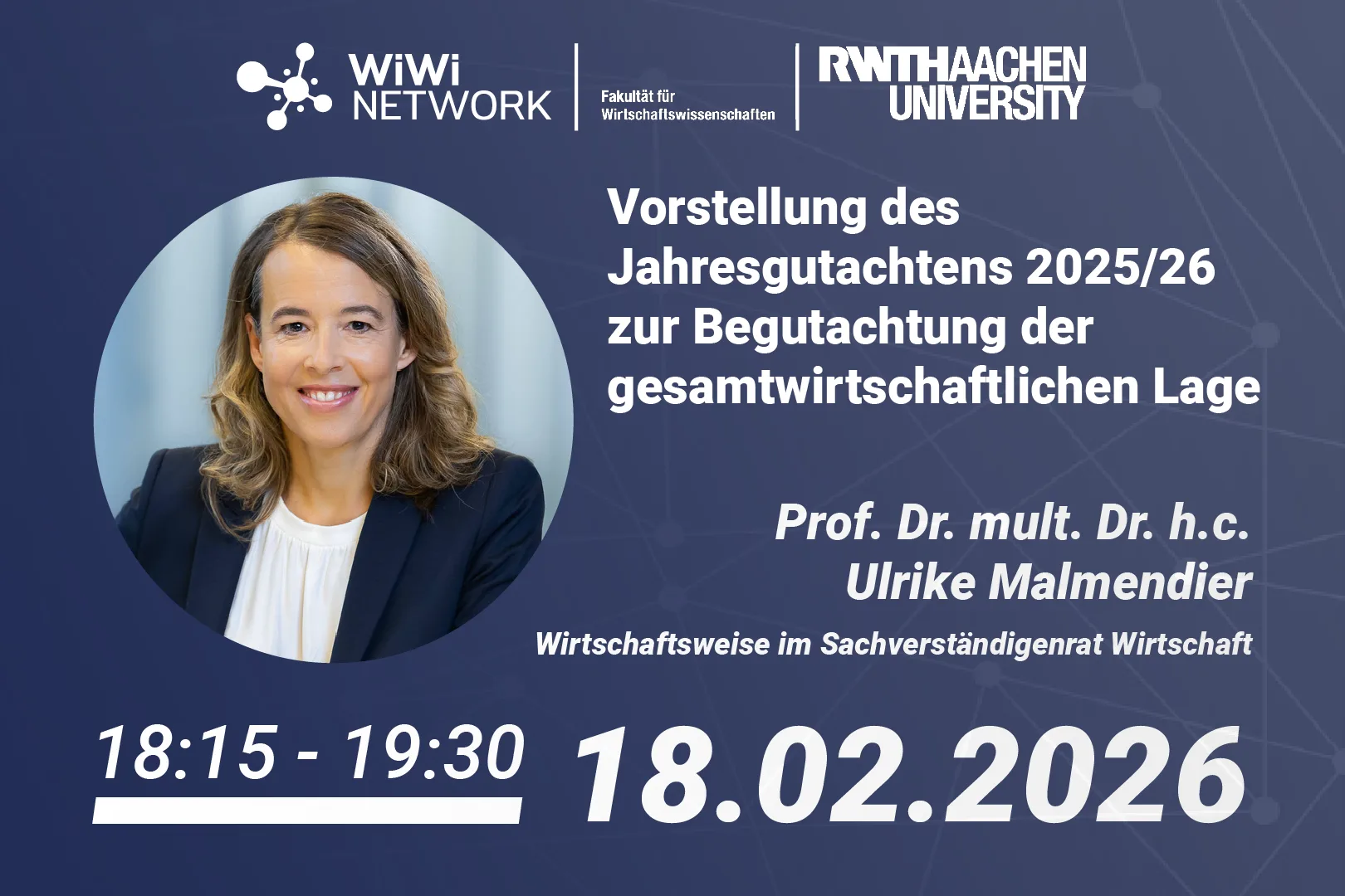 Wir freuen uns, diese Veranstaltung in Kooperation mit der Fakultät für Wirtschaftswissenschaften der RWTH Aachen University anbieten zu können. Unter dem Titel „Perspektiven für morgen schaffen – Chancen nicht verspielen“ findet an der RWTH Aachen die offizielle Vorstellung des Jahresgutachtens 2025/26 des Sachverständigenrates zur Begutachtung der gesamtwirtschaftlichen Entwicklung durch Ratsmitglied Prof. Dr. Ulrike Malmendier statt.